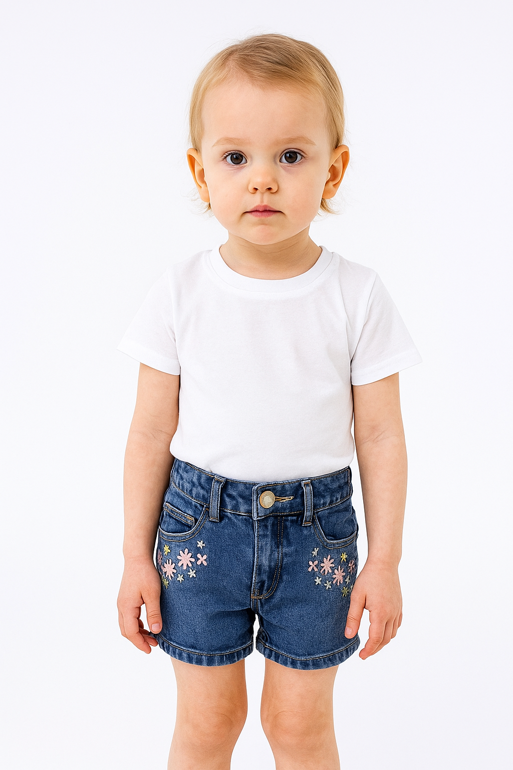 Made from a pure cotton denim fabric in a blue wash, she'll reach for these shorts all summer long. The shorts have an adorable embroidered flower design, with an elasticated waistband for easy pull-on wear, side and rear pockets and a frayed hem to the leg.